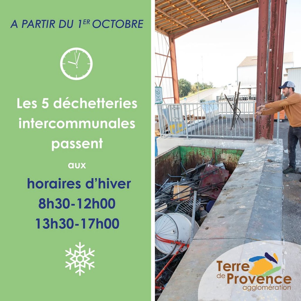 À partir du 1er octobre les horaires de vos 5 déchetteries intercommunales (Barbentane-Rognonas, Graveson-Maillane, Châteaurenard-Noves, Eyragues, Mollégès) changent.